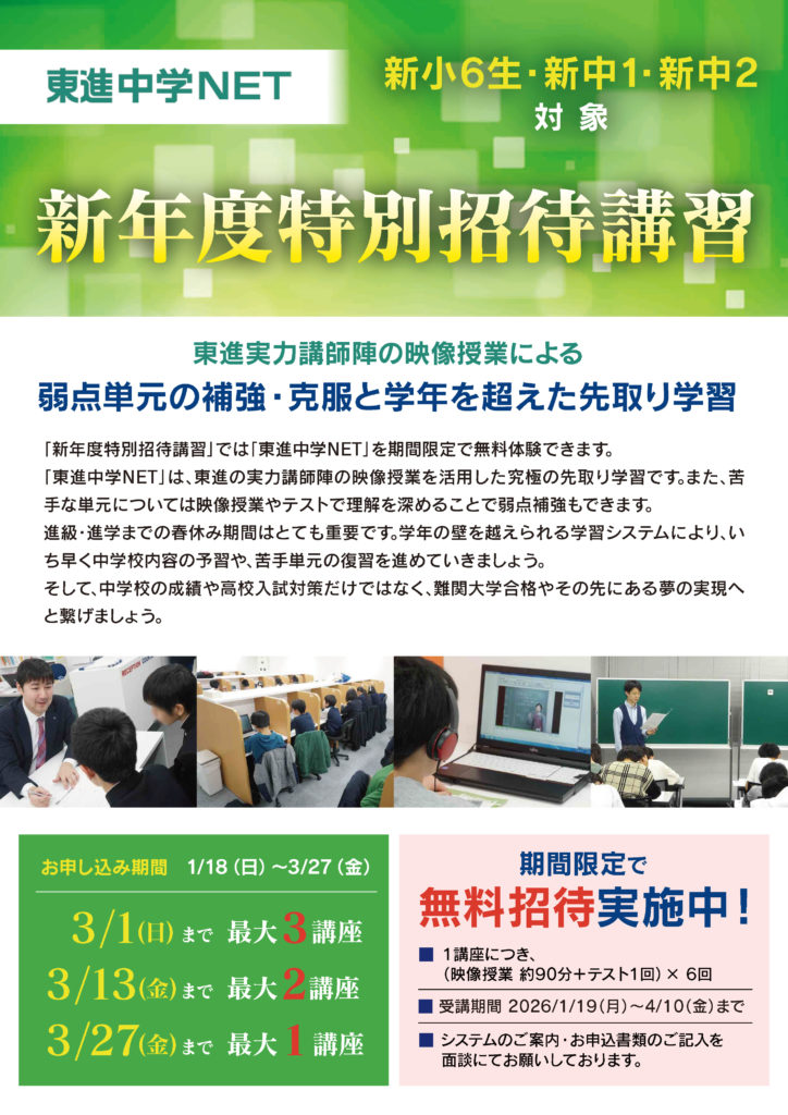 【東進中学NET】新年度特別招待講習お申し込みお問い合わせはこちら