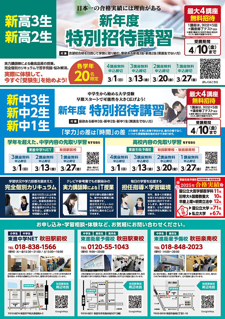 【東進衛星予備校】新高2生・高1生特別招待講習お申し込みお問い合わせはこちら